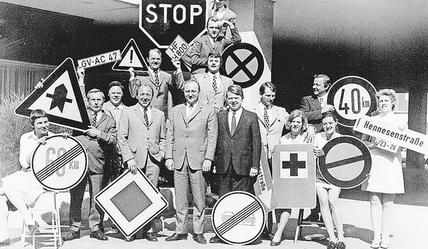 3M munkatársak fényvisszaverő bevonatú táblákkal a hatvanas években