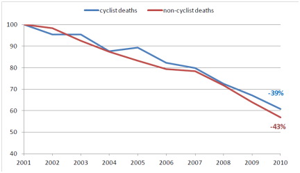 A kerékpáros áldozatok számában mérhető kedvező trendet jelzi, hogy az előző Fehér Könyv idején, azaz 2001. és 2010. között a baleset következtében életét vesztett kerékpárosok száma 39%-kal csökkent. Ez – bár elismerésre méltó eredmény – mégis elmarad az általános trendtől, hiszen más közúthasználók vonatkozásában (ide értve a gyalogosokat, egyéb járművezetőket, és utasokat) a balesetben meghalt személyek száma ugyanebben az időszakban 43%-kal csökkent. Ez látható a következő ábrán.